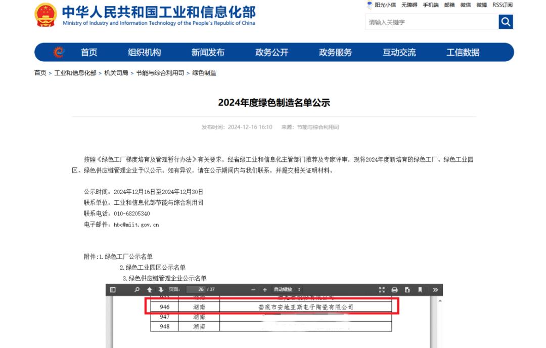 在可持續(xù)發(fā)展浪潮澎湃的當(dāng)下,工業(yè)領(lǐng)域的綠色轉(zhuǎn)型成為時(shí)代的必答題。近日,工業(yè)和信息化部公布了《2024年度綠色制造名單》,安地亞斯憑借在綠色制造領(lǐng)域的卓越表現(xiàn),榮獲“國(guó)家級(jí)綠色工廠”稱號(hào),此榮譽(yù)是公司在綠色制造領(lǐng)域首創(chuàng)突破,更是為電子陶瓷行業(yè)樹(shù)立了新標(biāo)桿。